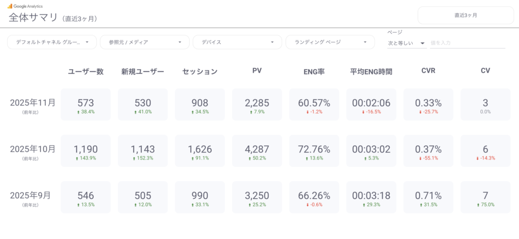 以下の画像のような「直近3ヶ月」に加え、「前年同月」や「時系列(月別)」での推移も別のシートで確認できます。