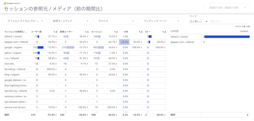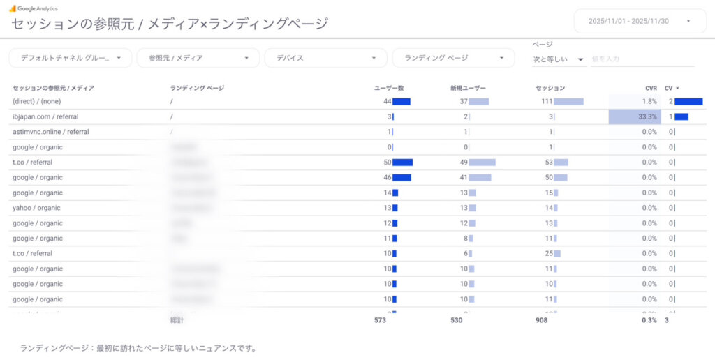 ホームページへのアクセスが「Google検索」なのか、「Yahoo」なのか、それとも「X」なのか「Instagram」なのか。流入源と数値が紐づいた結果が見られます。